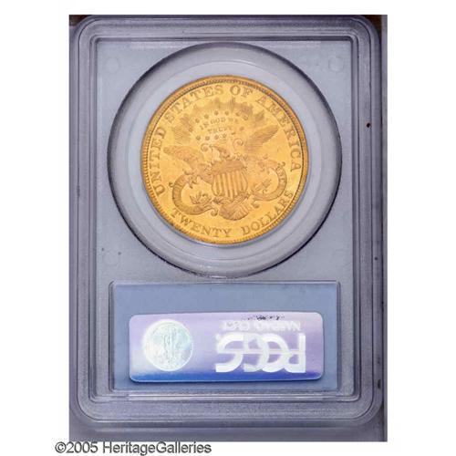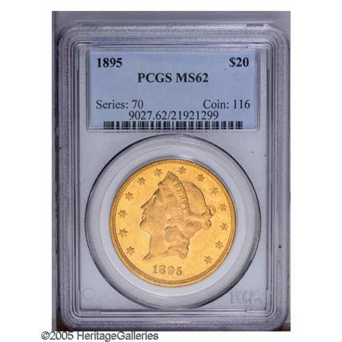 <B>1895<$20> MS62 PCGS.</B></I> A flashy and boldly struck piece with occasional moderate marks that serve to limit the grade. The honey-gold color is attractive, and the fields are mildly prooflike.