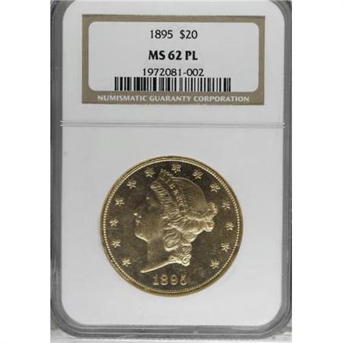 <B>1895 $20 MS62 Prooflike NGC.</B></I> A crisply struck and distinctly reflective yellow-gold representative of this higher-mintage P-mint issue, appealing despite light to moderate abrasions overall. Census: 13 in 62 Prooflike, 4 finer (8/07).<BR><BR><B>Coin Engraver:</B> James B. Longacre<BR><BR><b>Shipping:</b> Coins & Currency (<a target="_blank" href="http://www.heritageauctions.com/common/shipping.php">view shipping information</a>)