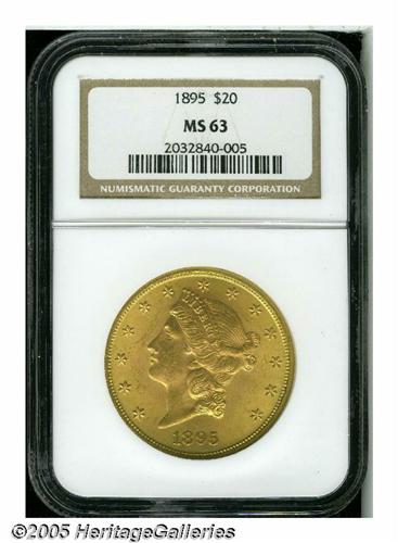 1895 $20 MS63 NGC. Fully struck with gleaming, lu