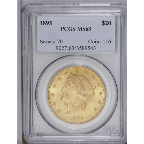 <B>1895<$20> MS63 PCGS.</B></I> Bright luster and pretty yellow-green and pink toning adorn the surfaces of this pleasing example. Well struck and decently preserved, with a few light surface blemishes, mostly on the obverse, that seem appropriate for the assigned grade level.