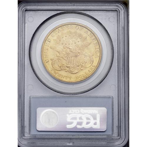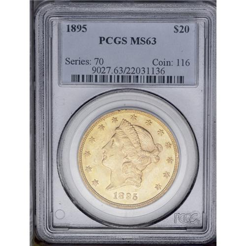 <B>1895<$20> MS63 PCGS.</B></I> Well struck with shimmering luster and attractive, typical green-gold and peach toning. A relatively modest number of scattered abrasions define the grade.