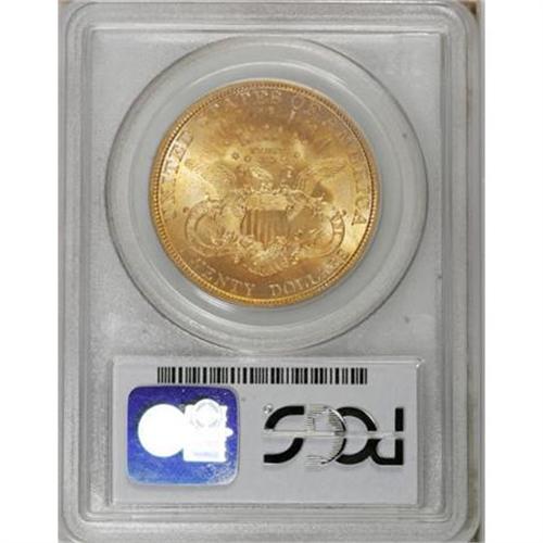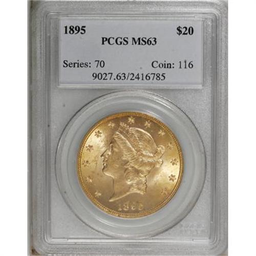 <B>1895 $20 MS63 PCGS.</B></I> PCGS Population (1268/201). NGC Census: (2444/365). Mintage: 1,114,656. Numismedia Wsl. Price for NGC/PCGS coin in MS63: $1,000. (#9027)<BR><BR><B>Coin Engraver:</B> James B. Longacre<BR><BR><b>Shipping:</b> Coins & Currency (<a target="_blank" href="http://www.heritageauctions.com/common/shipping.php">view shipping information</a>)