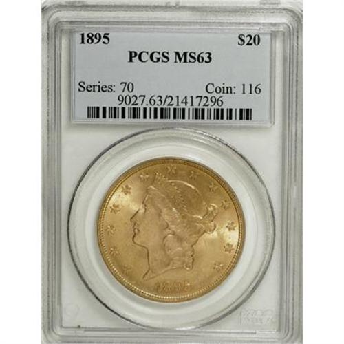 <B>1895 $20 MS63 PCGS.</B></I> PCGS Population (1298/205). NGC Census: (2470/378). Mintage: 1,114,656. Numismedia Wsl. Price for NGC/PCGS coin in MS63: $1,020. (#9027)<BR><BR><B>Coin Engraver:</B> James B. Longacre<BR><BR><b>Shipping:</b> Coins & Currency (<a target="_blank" href="http://www.heritageauctions.com/common/shipping.php">view shipping information</a>)