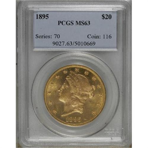 <B>1895 $20 MS63 PCGS.</B></I> Flashy cartwheel luster emboldens both sides of this nice Select piece. The orange-gold fields are somewhat prooflike, and save for a couple of ticks on Liberty's cheek that account for the grade, there are few relevant abrasions noted, even under a loupe.<BR><BR><B>Coin Engraver:</B> James B. Longacre<BR><BR><b>Shipping:</b> Coins & Currency (<a target="_blank" href="http://www.heritageauctions.com/common/shipping.php">view shipping information</a>)
