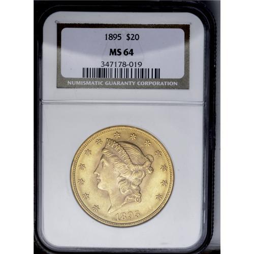 <B>1895<$20> MS64 NGC.</B></I> Vibrant luster dazzles smooth olive-gold surfaces. The strike is intricate save for slight incompleteness on the tops of Liberty's curls. 1895 is one of the few years in the Liberty double eagle series which witnessed similar productions on each coast: 1.11 million at Philadelphia and 1.14 million at San Francisco. NGC has certified a mere ten pieces finer.