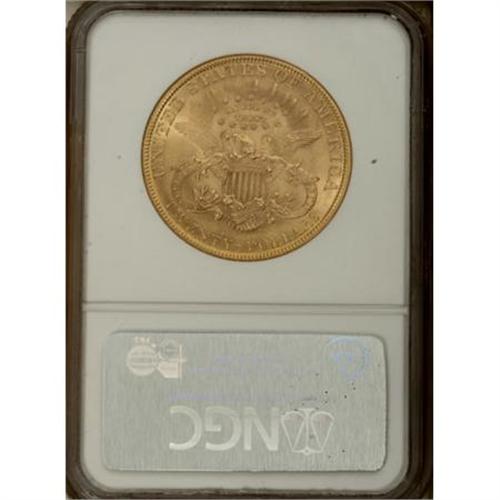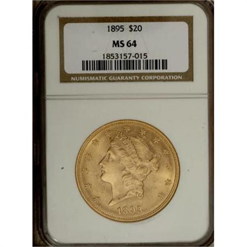<B>1895 $20 MS64 NGC.</B></I> Many 1895 double eagles were shipped overseas, and today the date is found in abundant numbers through MS63. Near-gems are somewhat more difficult, and anything finer is very elusive. Highly lustrous tan-gold surfaces of this MS64 reveal a penetrating strike, and are lightly abraded<BR><BR><B>Coin Engraver:</B> James B. Longacre<BR><BR><b>Shipping:</b> Coins & Currency (<a target="_blank" href="http://www.heritageauctions.com/common/shipping.php">view shipping information</a>)