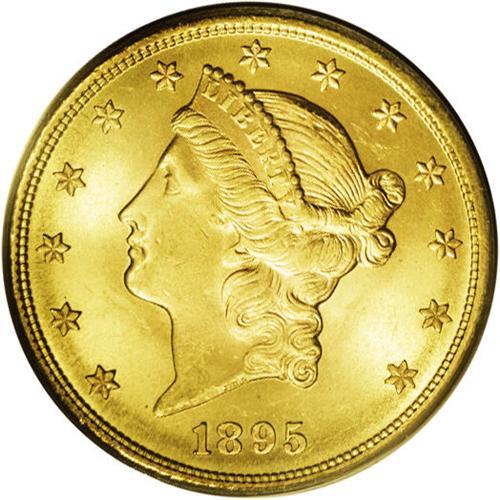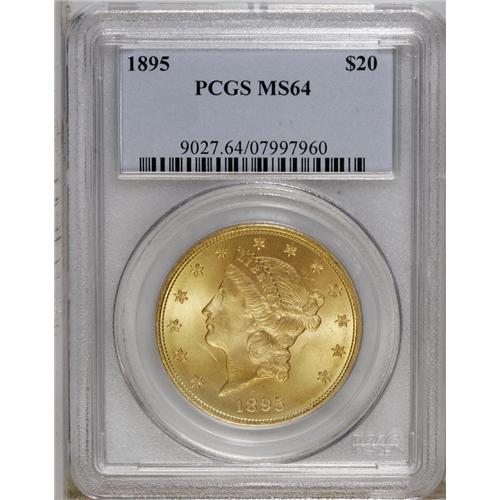 <B>1895<$20> MS64 PCGS.</B></I> An issue that is fairly available in MS64 but quite elusive in Gem grade, the 1895 saw a sizeable mintage of more than 1.1 million examples. Few abrasions are noted on the surfaces of this delectable piece, which boasts khaki-gold surfaces that are somewhat mattelike, with good luster and a bold strike. PCGS has graded only two pieces finer (9/06).