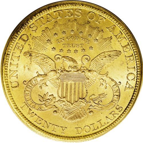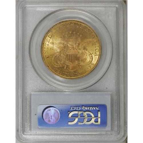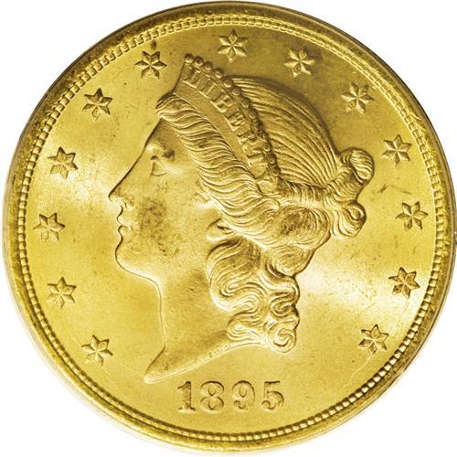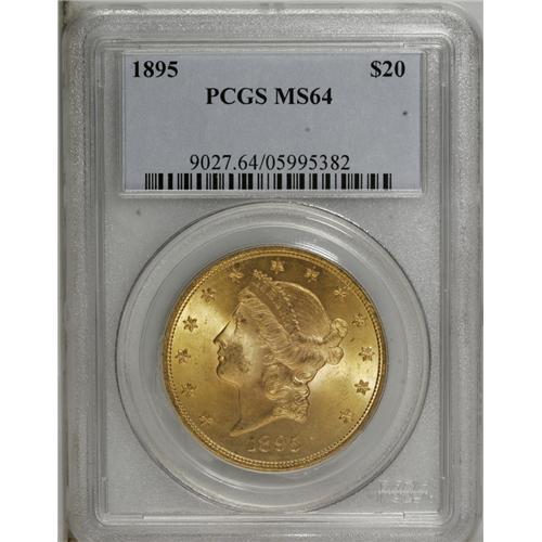 <B>1895 $20 MS64 PCGS.</B></I> More than one million double eagles were minted in Philadelphia in 1895. Several thousand pieces have survived in Mint State, but the great majority of those are graded between MS60 and MS63, by NGC and PCGS. The current near-Gem displays alluring mint luster that flows unimpeded over each side, and the light honey-gold and rose coloration is delightful. Some specks of grease were struck into the coin on the upper left side of the reverse, as a minor luster graze on Liberty's cheek seems to preclude the Gem assessment. Only two examples of this issue have been graded higher by PCGS (10/06).<BR><BR><b>Shipping:</b> Coin/Currency (<a target="_blank" href="http://www.heritageauctions.com/common/shipping.php">view shipping information</a>)