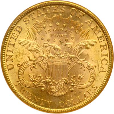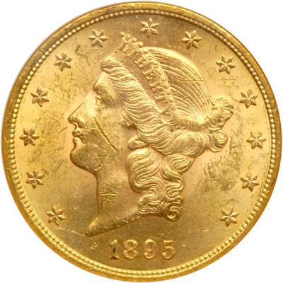 1895 $20. NGC graded MS-61. Golden hues and attractive underlying mint bloom; long scuff on the face.