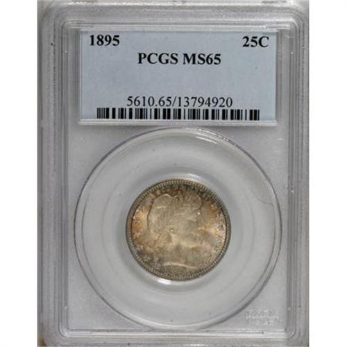 <B>1895 25C MS65 PCGS.</B></I> Like other, later Barber issues, the 1895 quarter was not saved in quantity, and Gems are condition rarities today. This shining, well struck example shows lovely amber and sapphire toning in the fields. A faint flaw on Liberty's cheek is of little concern. Population: 11 in 65, 11 finer (8/07).<BR><BR><B>Coin Engraver:</B> Charles E. Barber<BR><BR><b>Shipping:</b> Coins & Currency (<a target="_blank" href="http://www.heritageauctions.com/common/shipping.php">view shipping information</a>)