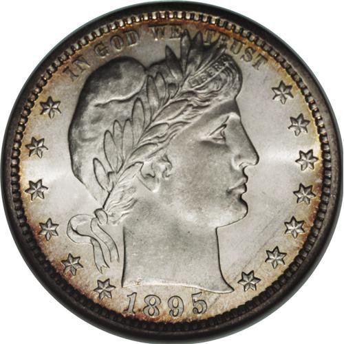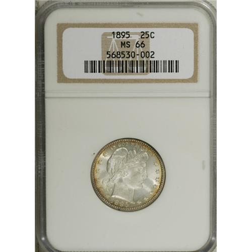 <B>1895 25C MS66 NGC.</B></I> The 1895 is the first of a small group of underappreciated Philadelphia in the Barber series. This is a highly appealing coin that remains bright white on the obverse with a touch of peripheral gold toning, and the reverse is evenly toned with blue, gray and russet over strong luster. Although a common date in lower grades, only a handful are found in Gem or better. Census: 7 in 66, 5 finer (11/06).<BR><BR><b>Shipping:</b> Coin/Currency (<a target="_blank" href="http://www.heritageauctions.com/common/shipping.php">view shipping information</a>)