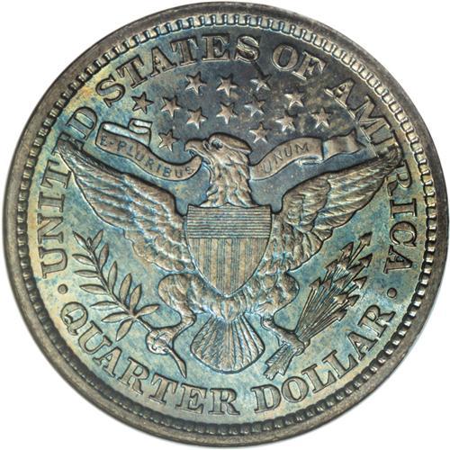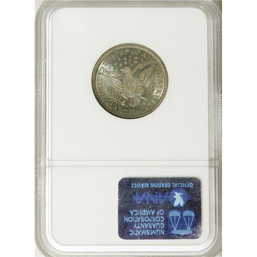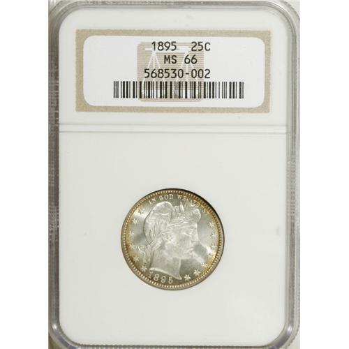 <B>1895 25C MS66 NGC.</B></I> The 1895, with its 4.440 million mintage, is a slightly better date, like the 1894-P (David Lawrence, 1994). This is a highly appealing Premium Gem that remains bright white on the obverse with a touch of peripheral gold toning, and the reverse is evenly toned with blue, gray and russet. A solid strike emboldens the design elements, and radiantly lustrous surfaces are devoid of significant marks. Only a handful are found in Gem or better. Census: 7 in 66, 5 finer (4/07).<BR><BR><b>Shipping:</b> Coins & Currency (<a target="_blank" href="http://www.heritageauctions.com/common/shipping.php">view shipping information</a>)