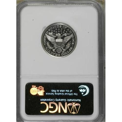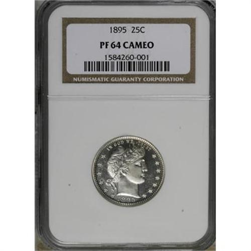 <B>1895 25C PR64 Cameo NGC.</B></I> This minimally toned Choice proof offers an excellent cameo effect with minimal patina. Though a few areas of haze appear on the faintly flawed obverse, the reverse offers stark black-and-white contrast. Census: 5 in 64 Cameo, 37 finer (3/08).<BR><BR><b>Shipping:</b> Coins & Currency (<a target="_blank" href="http://www.heritageauctions.com/common/shipping.php">view shipping information</a>)
