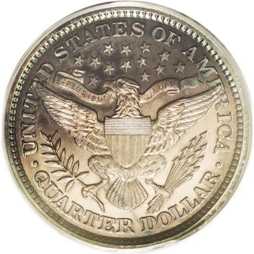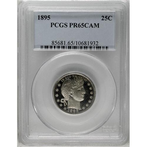 <B>1895<25C> PR65 Cameo PCGS.</B></I> This is an important opportunity for the Barber collector or for the collector of 19th century proof coinage. The obverse is mostly brilliant with highly lustrous central design motifs, surrounded by pale lilac and steel color at the borders. The reverse has much deeper lilac and steel color over the entire surface, masking the contrast on that side. Attractive and highly desirable. Population: 7 in 65, 15 finer (5/06).