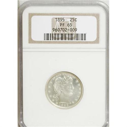 <B>1895 25C PR65 NGC.</B></I> We present here a stunning Gem proof that displays some Cameo characteristics, especially on the obverse. Freckles of light tan show up under magnification on the reverse. A solid strike leaves virtually complete definition on the design elements. What appears to be a piece of wire was struck through on the nose.<BR><I>From The Southwest Collection.</B></I><BR><BR><B>Coin Engraver:</B> Charles E. Barber<BR><BR><b>Shipping:</b> Coins & Currency (<a target="_blank" href="http://www.heritageauctions.com/common/shipping.php">view shipping information</a>)
