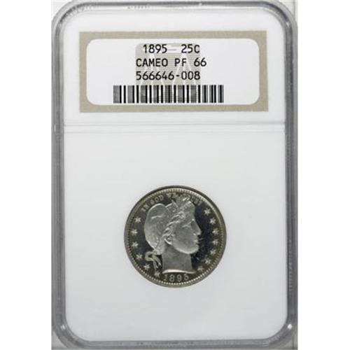 <B>1895 25C PR66 Cameo NGC.</B></I> A beautiful Premium Gem with exceptional contrast between the frosty devices and mirrored fields. Both sides are brilliant and untoned, allowing the exquisite cameo appearance to stand out at its fullest advantage. Census: 13 in 66 Cameo, 19 finer (1/08).<BR><BR><b>Shipping:</b> Coins & Currency (<a target="_blank" href="http://www.heritageauctions.com/common/shipping.php">view shipping information</a>)