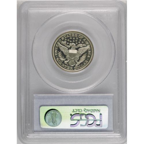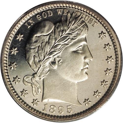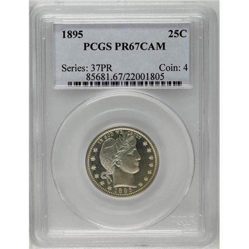 <B>1895<25C> PR67 Cameo PCGS.</B></I> This Superb Cameo proof example is a sensational specimen, and highly desired due to the popularity of this date, a situation created by the proof-only Morgan dollar issue. It is often the case that the successful purchaser of an 1895 Morgan silver dollar goes on to complete the proof set for the year. This example is essentially brilliant with a hint of peripheral gold color. The fields are deeply mirrored with highly lustrous devices. It appears that this is a borderline Deep Cameo example. Population: 4 in 67, 1 finer (4/06).