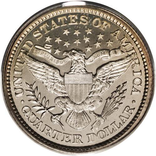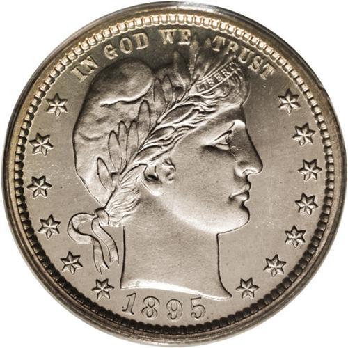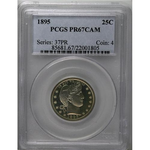 <B>1895<25C> PR67 Cameo PCGS.</B></I> This Superb Cameo proof example is a sensational specimen, and highly desirable because of the popularity of this date, a situation created by the proof-only Morgan dollar issue. It is often the case that the successful purchaser of an 1895 Morgan silver dollar goes on to complete the proof set for the year. This example is essentially brilliant with a hint of peripheral gold color. The fields are deeply mirrored with highly lustrous devices. It appears that this is a borderline Deep Cameo example. Population: 4 in 67, 1 finer (8/06).