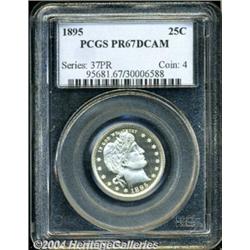 <B>1895<25C> PR67 Deep Cameo PCGS.</B></I> This high end representative is possessed of extraordinary eye appeal. Perhaps the most impressive feature is the remarkable degree of cameo contrast between the richly frosted devices and the glassy, deeply mirrored fields. Neither toning nor grade-limiting blemishes interrupt the radiant sheen of this fully detailed Superb Gem. The typically seen "shepherd's hook" inverted lintmark is visible in front of Liberty's eye. Population: 2 in 67 Deep Cameo, with just one finer (3/04).<BR><I>Ex: New York Signature Sale (Heritage, 7/02), lot 7865, which realized $5,750.</B></I><BR><I>From the JFS Collection.</B></I> <BR><BR><B>Important notice:</B> Heritage usually auctions material at the rate of 200-250 lots per hour. On some occasions eBay Live bid software or the Internet may not be able to keep up with the pace of the auction. We recommend placing a realistic absentee bid now as insurance to avoid disappointment. Occasionally the auctioneer may eliminate or reject an eBay Live bid, and the auctioneer may also reopen a lot after the close of the eBay live bidding (usually because we missed an audience bid), and may reject your bid even if it shows you as the winning bidder. By bidding via eBay Live, you agree that Heritage may award the lot to another bidder at its sole discretion under the circumstances described above or any other reasonable circumstances. Since eBay bids are not shown to us until we open the lot on the floor, we treat those bids just like floor bids. In most cases the floor responds before the eBay bid is presented to us, due to Internet lag time, so for consistency we have made it a policy that floor bids are always considered first over tie eBay live bids. Also please note that all Heritage lots purchased through eBay Live carry a 20% Buyer's Premium. Please make sure you read the Terms and Conditions before you bid. </span></font></tr></table></td></tr></table>