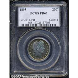 1895 25C PR67 PCGS. Olive and aqua-marine colors bathe the obverse, while the reverse has vivid burnt-orange, mauve, and apple-green patina. An exquisitely struck Superb Gem with a seemingly pristine reverse and a carefully preserved obverse. The raised and curled die scratch near Liberty's eye is of mint origin, and is usually present on this proof issue. Population: 18 in 67, 1 finer (10/03). Important notice: Heritage usually auctions material at the rate of 200-250 lots per hour. On some occasions eBay Live bid software or the Internet may not be able to keep up with the pace of the auction. We recommend placing a realistic absentee bid now as insurance to avoid disappointment. Occasionally the auctioneer may eliminate or reject an eBay Live bid, and the auctioneer may also reopen a lot after the close of the eBay live bidding (usually because we missed an audience bid), and may reject your bid even if it shows you as the winning bidder. By bidding via eBay Live, you agree that Heritage may award the lot to another bidder at its sole discretion under the circumstances described above or any other reasonable circumstances. Also please note that all Heritage lots purchased through eBay Live carry a 20% Buyer's Premium. Please make sure you read the Terms and Conditions before you bid.