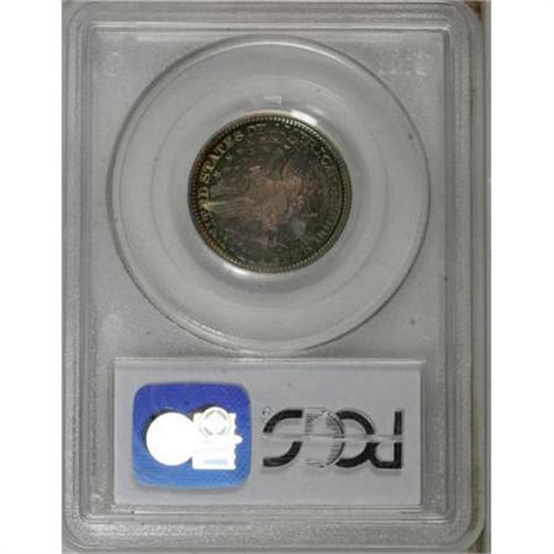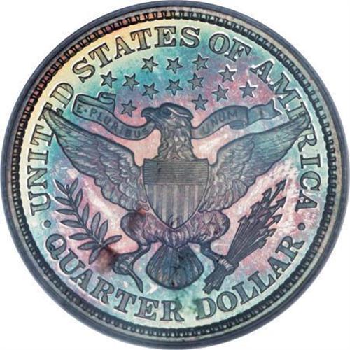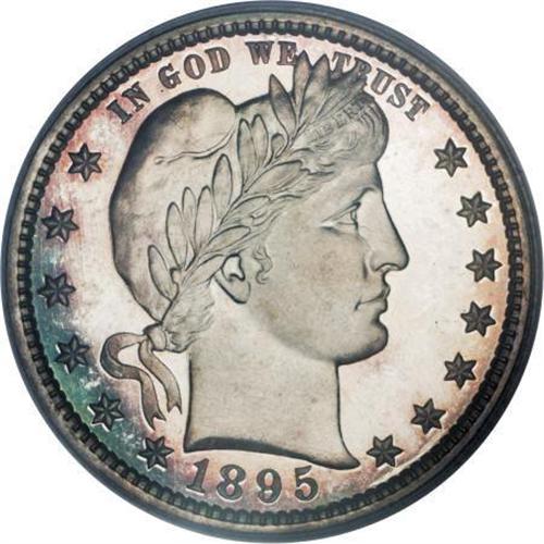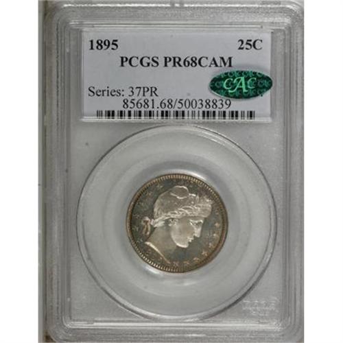 <B>1895 25C PR68 Cameo PCGS. CAC.</B></I> An absolutely extraordinary proof type coin that has been left to tone naturally over the past century-plus. The reverse has deep colors that include sea-green, gold, and rose-red; the obverse is more brilliant with a peripheral ring of gunmetal-blue and pink-champagne. The deeply mirrored fields on each side provide a strong backlight to the toned surfaces. A diagnostic small curlicue-shaped lint mark (as struck) rests directly before Liberty's eye, one that is present on many 1895 proof quarters. As expected of the high grade, there are no reportable problems or detractions on either side of this near-perfect specimen. This is the single finest piece of the proof issue graded at PCGS (12/07).<BR><BR><b>Shipping:</b> Coins & Currency (<a target="_blank" href="http://www.heritageauctions.com/common/shipping.php">view shipping information</a>)