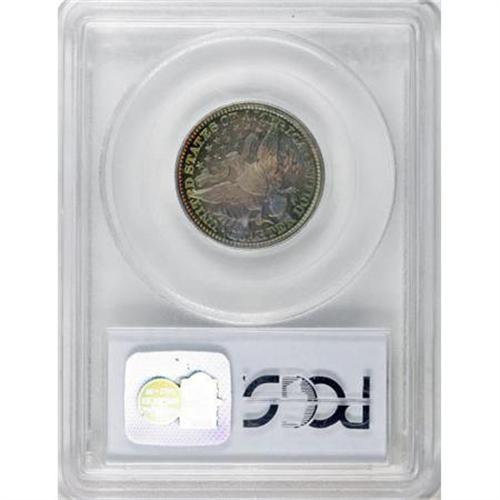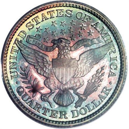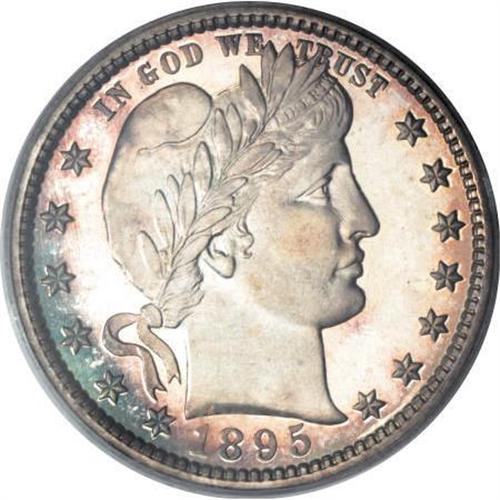 <B>1895 25C PR68 Cameo PCGS. CAC.</B></I> An absolutely extraordinary proof type coin that has been left to tone naturally over the past century-plus. The reverse has deep colors that include sea-green, gold, and rose-red; the obverse is more brilliant with a peripheral ring of gunmetal-blue and pink-champagne. The deeply mirrored fields on each side provide a strong backlight to the toned surfaces. A diagnostic small curlicue-shaped lint mark (as struck) rests directly before Liberty's eye, one that is present on many 1895 proof quarters. As expected of the high grade, there are no reportable problems or detractions on either side of this near-perfect specimen. This is the single finest piece of the proof issue graded at PCGS (1/08).<BR><BR><b>Shipping:</b> Coins & Currency (<a target="_blank" href="http://www.heritageauctions.com/common/shipping.php">view shipping information</a>)