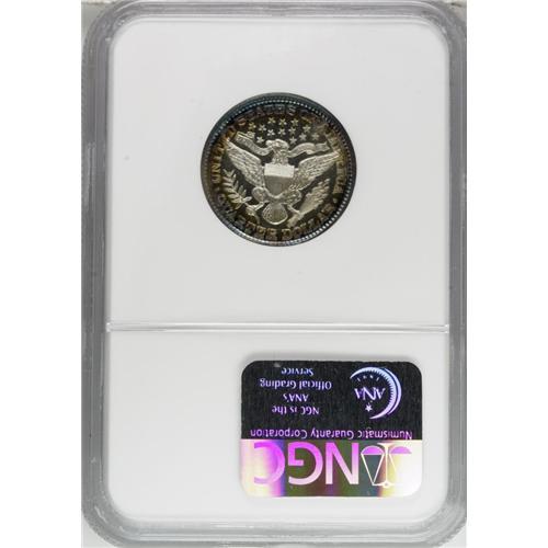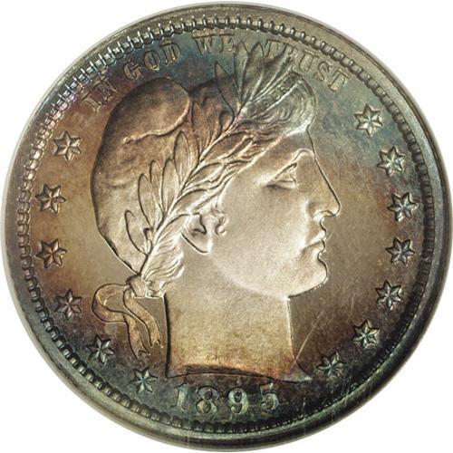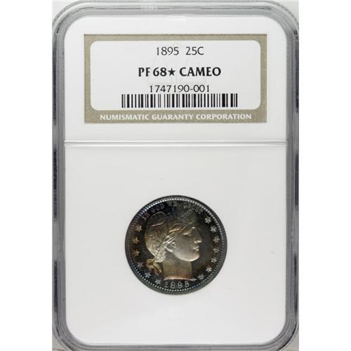 <B>1895 25C PR68 <img border='0' src='http://www.heritagecoins.com/images/star.gif' width=10 height=10> Cameo NGC.</B></I> Nearly 400 proof 1895 quarters, from an original mintage of 880 pieces, have been certified by NGC and PCGS, and approximately 75 proofs have been assigned the Cameo designation. This PR68 specimen has been given the coveted Star designation. Incredible cobalt-blue, lavender, and golden-brown toning at the margins complements the needle-sharp strike and immaculately preserved surfaces. An interesting raised lint mark is located near the nose under the eye. Census: 1 in 68 S, 1 finer (12/06).<BR><BR><b>Shipping:</b> Coin/Currency (<a target="_blank" href="http://www.heritageauctions.com/common/shipping.php">view shipping information</a>)