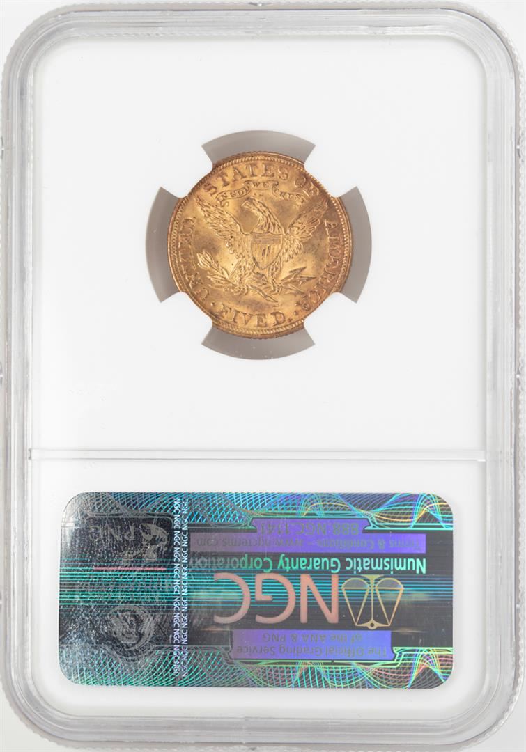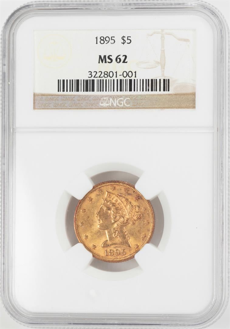 One 1895 $5 Liberty Head Half Eagle Gold Coin NGC MS62. NGC Certified.