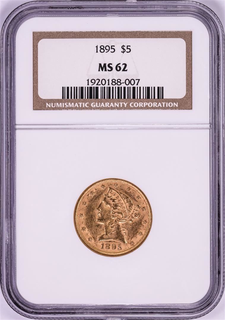 One 1895 $5 Liberty Head Half Eagle Gold Coin NGC MS62. NGC Certified.