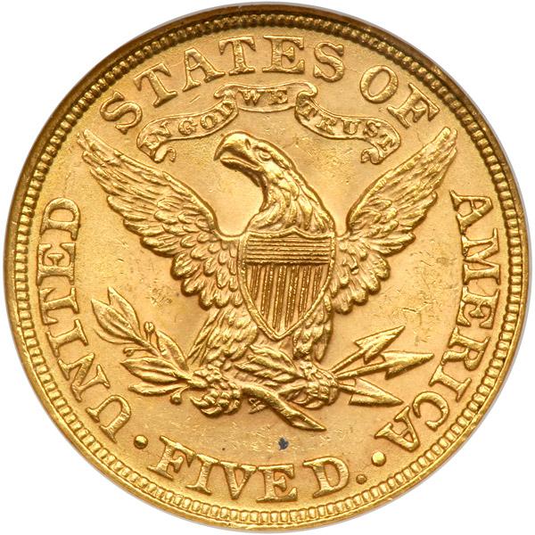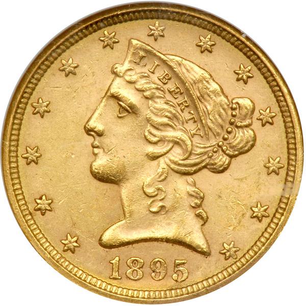 1895 $5 Liberty. NGC graded MS-63. Frosty and untoned with eye-pleasing luster (PCGS # 8390) .