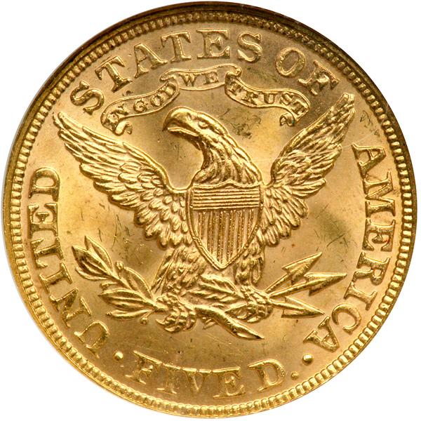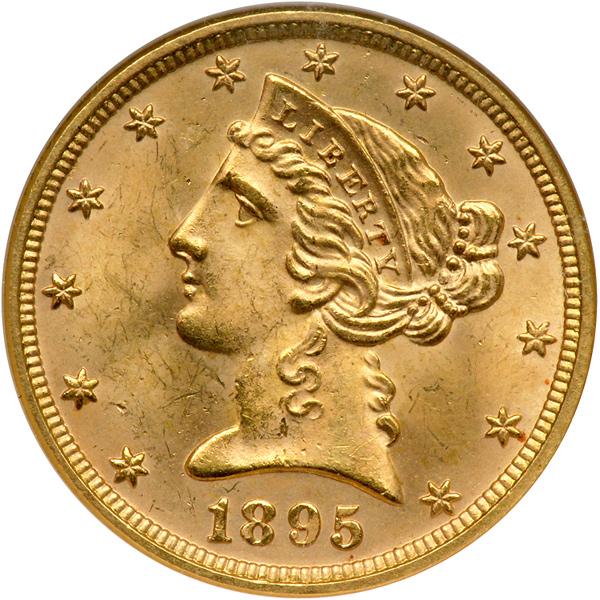 1895 $5 Liberty. NGC graded MS-65. Fresh and original, as befits a coin in which the surfaces are awash in rich reddish-gold color. This is a strongly struck Gem, including nice detail to all the important high points. If your Type Set aches for a coin that is larger than life, then we suggest placing a bid on this beautiful 1895-P half eagle (PCGS # 8390) .