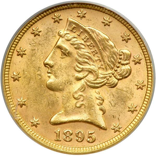 1895 $5 Liberty. PCGS graded MS-62+. Well struck (PCGS # 8390) .