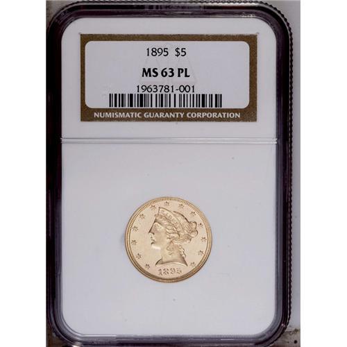 <B>1895<$5> MS63 Prooflike NGC.</B></I> This flashy and attentively struck half eagle has relatively clean surfaces, and the field reflectivity is impressive. A common date in abraded Mint State grades, but prooflike pieces remain scarce. Census: 2 in 63 Prooflike, 0 finer (3/06). <BR><BR><B>Important notice:</B> Heritage usually auctions material at the rate of 200-250 lots per hour. On some occasions eBay Live bid software or the Internet may not be able to keep up with the pace of the auction. We recommend placing a realistic absentee bid now as insurance to avoid disappointment. Occasionally the auctioneer may eliminate or reject an eBay Live bid, and the auctioneer may also reopen a lot after the close of the eBay live bidding (usually because we missed an audience bid), and may reject your bid even if it shows you as the winning bidder. By bidding via eBay Live, you agree that Heritage may award the lot to another bidder at its sole discretion under the circumstances described above or any other reasonable circumstances. Since eBay bids are not shown to us until we open the lot on the floor, we treat those bids just like floor bids. In most cases the floor responds before the eBay bid is presented to us, due to Internet lag time, so for consistency we have made it a policy that floor bids are always considered first over tie eBay live bids. Also please note that all Heritage lots purchased through eBay Live carry a 20% Buyer's Premium. Please make sure you read the Terms and Conditions before you bid. This lot is being auctioned in conjunction with a live floor auction by Heritage Galleries & Auctioneers. All final auction and invoice information will be supplied by Heritage Galleries & Auctioneers, and all other information should be considered preliminary. Lot:2837 <BR><BR><B>Winning Notification and Billing:</B> After the FINAL session in this auction is complete, Heritage will send e-mail and snail mail invoices. This process normally takes several days. All final auction and invoice information will be supplied by Heritage Galleries & Auctioneers, and all other information should be considered preliminary. <BR><BR>This auction will be conducted on a live auction floor and over the Internet through eBay Live. If you choose to place an absentee bid, please take a moment to <font color='#0000ff'><u><a href='http://pages.ebay.com/liveauctions/help/before/laabsentee.html'>learn how eBay Live absentee bidding works</a></u></font><font color='#000000'>