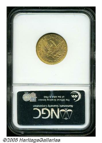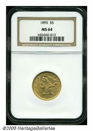 <B>1895<$5> MS64 NGC.</B></I> The '95 is one of the most common dates in the Liberty Head series. This piece exhibits soft luster and honey-gold patina. Some minute marks on Liberty's face and neck preclude a higher grade.