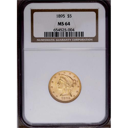<B>1895<$5> MS64 NGC.</B></I> Well struck and nicely preserved, with rich luster and pleasing reddish-gold coloration over both sides. A few wispy abrasions prevent a higher grade. A relatively scarcer date at the near-Gem level.