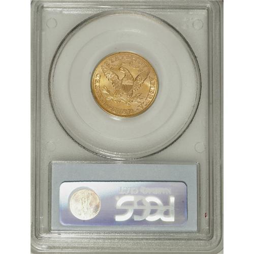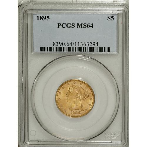 <B>1895 $5 MS64 PCGS.</B></I> Frosty and immensely appealing with elements of yellow-gold and orange on each side. This crisply struck piece has just a few too many marks to qualify as a Gem. Population: 98 in 64, 15 finer (3/07).<BR><BR><b>Shipping:</b> Coins & Currency (<a target="_blank" href="http://www.heritageauctions.com/common/shipping.php">view shipping information</a>)