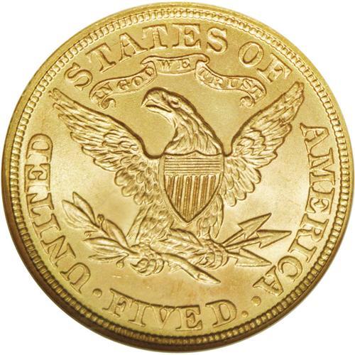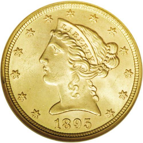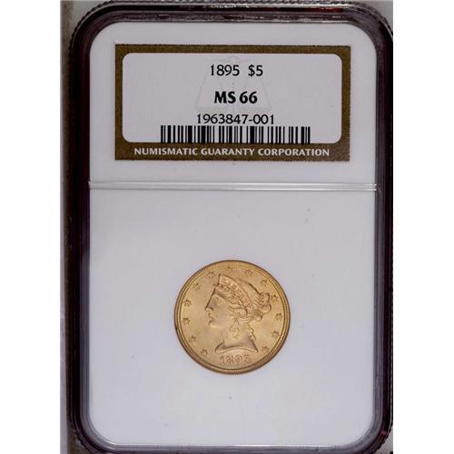 <B>1895<$5> MS66 NGC.</B></I> This is a gorgeous Gem example, one of the better known specimens of the date. The surfaces are fully brilliant with frosty orange luster and hints of pink toning. A few tiny abrasions are visible on each side, but only with microscopic scrutiny. This is only the third time since 1993 that we have offered an example of this date in any grade better than MS65. Census: 5 in 66, 2 finer (2/06).