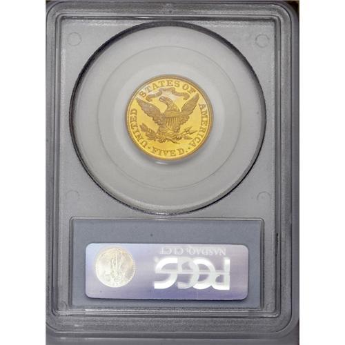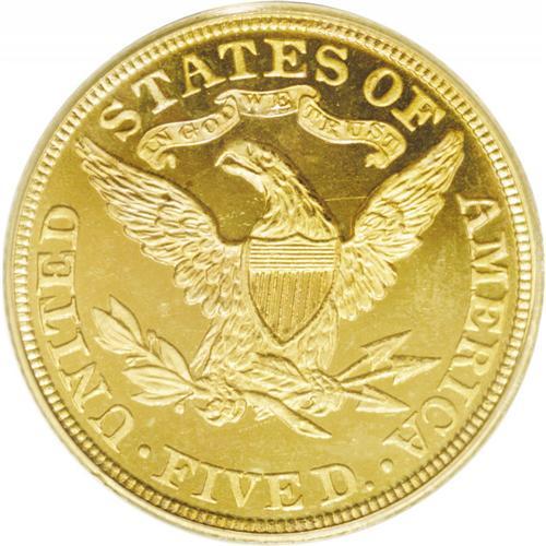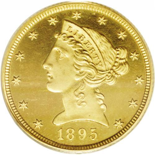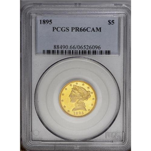<B>1895<$5> PR66 Cameo NGC.</B></I> An exceptional Gem that exudes eye appeal for the well frosted devices which are wonderfully offset by the textbook orange peel mirror fields. Of paramount importance is the quality of the surfaces, for rarely are these delicate Proof gold coins found with such sterling quality. Most show significant hairlines or contact marks which are easily caused during all but the most careful examination. For identification there is a minute tick near Liberty's truncation above the 5 and a tiny planchet flake within Liberty's flowing curls on the back of her head. In terms of rarity, this is the finest graded by PCGS in the Cameo category, with a technically matching coin found their Deep Cameo category which may be the finest to survive. Toned with graceful orange-gold and yellow-gold hues over both sides.<BR><BR> Grover Cleveland was President in 1895, serving his second four year term which began in 1893. Interestingly, Cleveland was first elected to the White House in 1885, then lost his bid for reelection in 1889, this despite winning the popular vote, Benjamin Harrison won the electoral votes needed to edge Cleveland out. Cleveland regained the office of the Presidency after the four year break, and is the only President to have accomplished this feat. He was a true fiscal conservative and barred favors to any economic or political group. When Congress voted to appropriate $10,000 to distribute seed to drought-stricken farmers in Texas, Cleveland vetoed the bill. He wrote "Federal aid in such cases encourages the expectation of paternal care on the part of the Government and weakens the sturdiness of our national character..." Such views have apparently become less popular with most politicians these days.<BR><I>From The Larj Collection.</B></I>