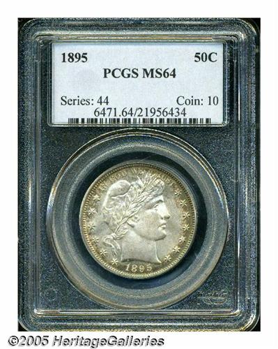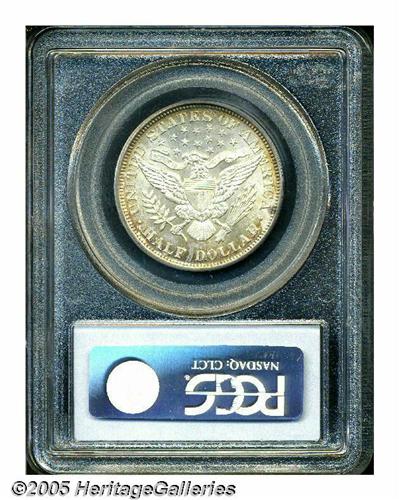 <B>1895<50C> MS64 PCGS.</B></I> Splotches of gold-brown, lilac, and cobalt-blue patina gravitate to the rims of this highly lustrous, silvery Barber half. The design elements are well struck. A couple of minor obscure marks on the rear of Liberty's cap are hardly worth mentioning, and a few wispy slide marks are seen on Liberty's cheek and neck.
