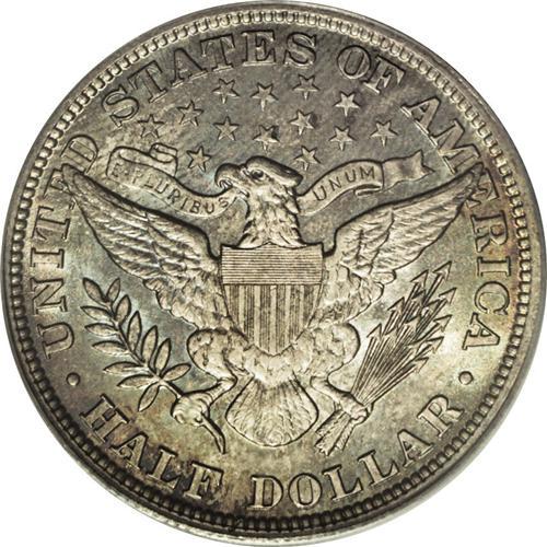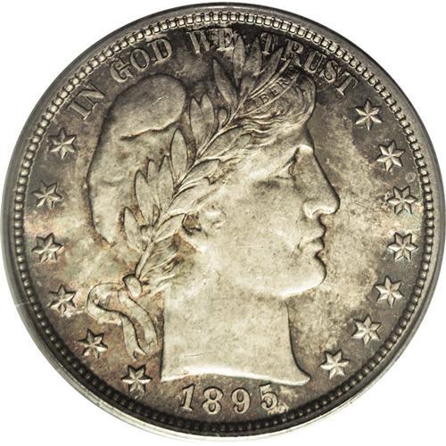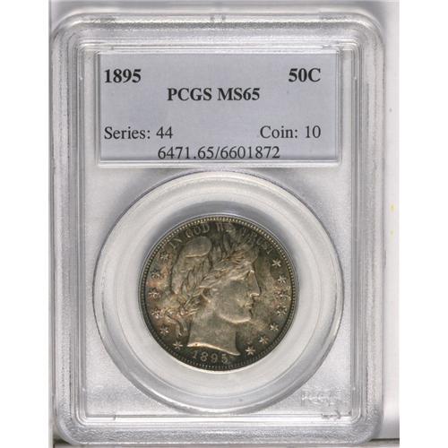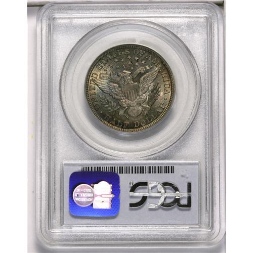 <B>1895<50C> MS65 PCGS.</B></I> Vibrant luster illuminates the originally toned surfaces of this well struck Gem. Deep brownish-gray coloration is intermingled with electric-blue, turquoise-green, and tomato-red patina. The coin's few trivial blemishes are effectively concealed by the rich toning. Population: 16 in 65, 6 finer (6/06).