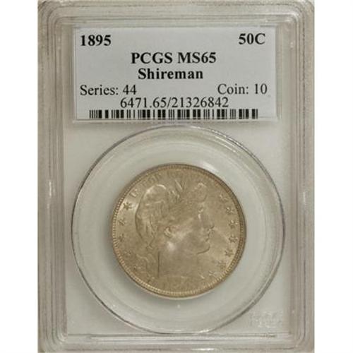 <B>1895 50C MS65 PCGS.</B></I> Ex: Shireman. This lustrous dove-gray and almond-gold Gem is intricately struck, and the reverse is virtually immaculate. The obverse is also well preserved. The 1895 is a plentiful date in circulated grades, but is very scarce in Mint State, and desirable with unblemished surfaces. Population: 16 in 65, 6 finer (6/07).<BR><BR><B>Coin Engraver:</B> Charles E. Barber<BR><BR><b>Shipping:</b> Coins & Currency (<a target="_blank" href="http://www.heritageauctions.com/common/shipping.php">view shipping information</a>\)