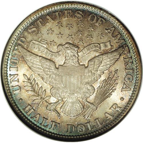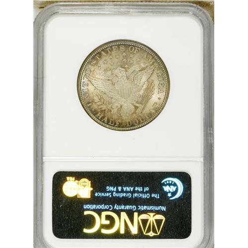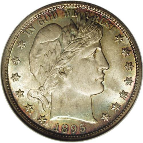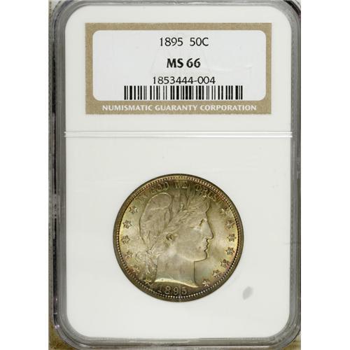 <B>1895 50C MS66 NGC.</B></I> An absolutely stunning Premium Gem with frosty mint luster on both sides, masked by pastel gray, gold, and iridescent toning. A few tiny ticks on Liberty's profile are all that keep it from an even higher grade and honors as the finest certified. Census: 3 in 66, 0 finer (12/06).<BR><BR><b>Shipping:</b> Coins & Currency (<a target="_blank" href="http://www.heritageauctions.com/common/shipping.php">view shipping information</a>)