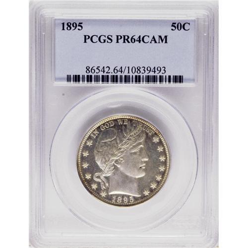 <B>1895 50C PR64 Cameo PCGS.</B></I> Cameo Barber coins are more available for early issues than for late issues, possibly due to a change in technique at the Mint. Light haze in the fields scarcely dims the contrast of this Choice Cameo proof, moderately reflective with light champagne toning overall and rich gold-orange patina at the rims. The fields exhibit only a few faint hairlines. Population: 5 in 64 Cameo, 10 finer (3/07).<BR><BR><b>Shipping:</b> Coins & Currency (<a target="_blank" href="http://www.heritageauctions.com/common/shipping.php">view shipping information</a>)