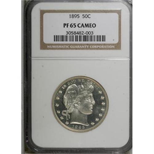 <B>1895 50C PR65 Cameo NGC.</B></I> Except for a darker toning area in the upper shield, this Gem Cameo is color free. Sharply struck, mildly frosted design features stand out against the mirrored fields. Some minor luster grazes on the cheek and neck preclude an even higher grade. Census: 7 in 65 Cameo, 33 finer (9/07).<BR><BR><b>Shipping:</b> Coins & Currency (<a target="_blank" href="http://www.heritageauctions.com/common/shipping.php">view shipping information</a>)