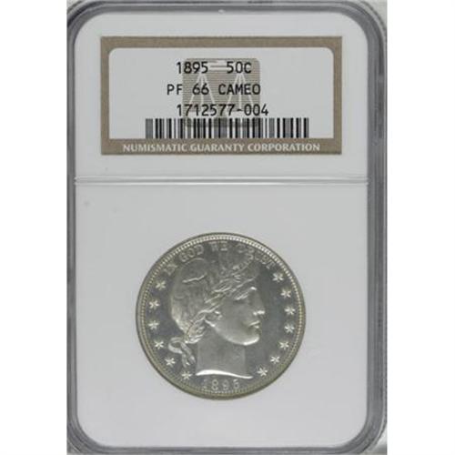 <B>1895 50C PR66 Cameo NGC.</B></I> Fully struck with beautiful light-gold toning across some of the highpoints, and lovely, watery depths of reflectivity in the fields. The devices are frosted and the resulting cameo contrast is noteworthy. There is no indication of contact or improper handling on either side of this visually alluring Premium Gem. The 1895 proof Barber half had a typically small mintage of 880 pieces, and few of those coins remain in such exemplary condition. Census: 17 in 66 Cameo, 17 finer (12/07). <BR><BR><b>Shipping:</b> Coins & Currency (<a target="_blank" href="http://www.heritageauctions.com/common/shipping.php">view shipping information</a>)