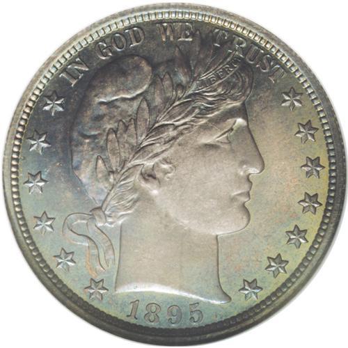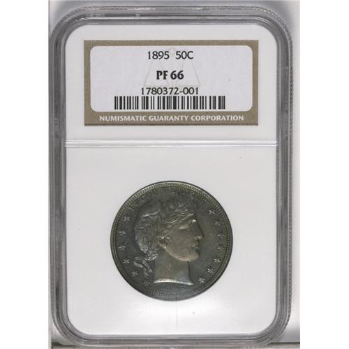 <B>1895<50C> PR66 NGC.</B></I> Breen-5057. Repunched 1 in date. Deep iridescent electric-blue and crimson-golden colors embrace each side in a somewhat variegated fashion. The reverse is somewhat lighter in tone. Even close examination fails to reveal any mentionable marks or other flaws, as would be expected of the assigned grade. Only 880 proofs were issued in 1895, the same amount as the famous 1895 silver dollar.