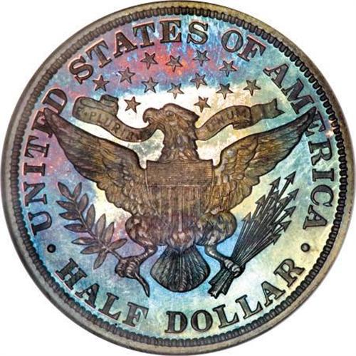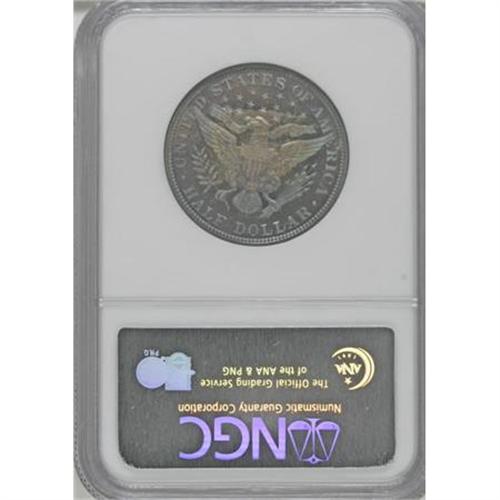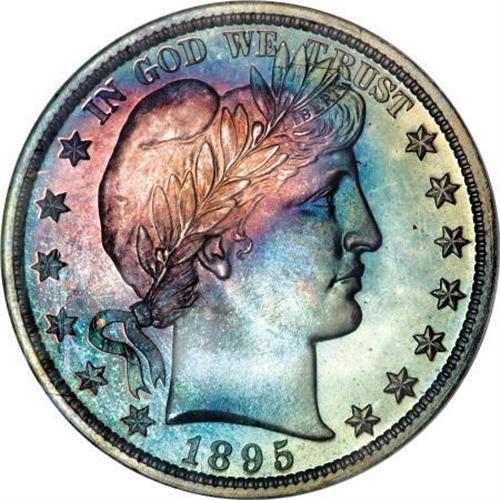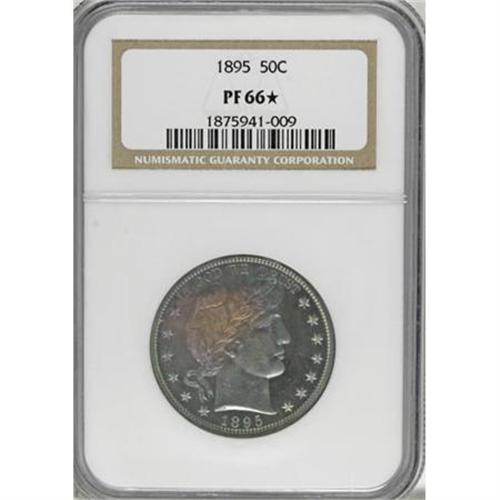 <B>1895 50C PR66 <img src="/images/star.gif" width="10" height="10" alt="" border="0"> NGC.</B></I> Medium intensity cobalt-blue, violet, and tan-mauve patination adheres to both faces of this Premium Gem. Excellent detail is apparent on the design features, and well preserved surfaces are devoid of bothersome marks. Mild field-motif contrast is visible when the coin is rotated beneath a light source. Census: 1 in 66 <B><img src="/images/star.gif" width="10" height="10" alt="" border="0"></B></I>, 2 finer with Star(11/07).<BR><BR><B>Coin Engraver:</B> Charles E. Barber<BR><BR><b>Shipping:</b> Coins & Currency (<a target="_blank" href="http://www.heritageauctions.com/common/shipping.php">view shipping information</a>)