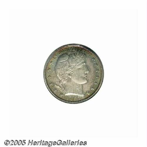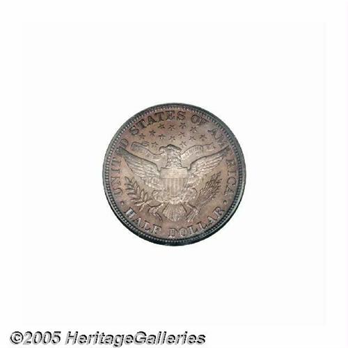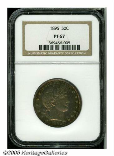 <B>1895<50C> PR67 NGC.</B></I> A well mirrored specimen layered in a cornucopia of emerald-green and orange-gold iridescent toning that has a curious brush-like appearance in the obverse fields. All devices appear to be fully struck up. Population: 21 in 67, 12 finer (5/05).