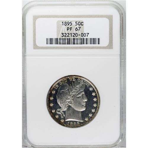 <B>1895 50C PR67 NGC.</B></I> The 1895 is one of the more available proofs in the series, but this is one of the more exceptional pieces we have seen recently and it certainly represents excellent value, even at this grade level. The surfaces are pristine and generally brilliant except for a light accent of golden-brown around the margins. The devices are noticeably frosted and present a strong contrast against the deep reflectivity seen in the fields--it is a wonder this coin has not been certified as a Cameo. An amazing proof Barber half.<BR><BR><b>Shipping:</b> Coin/Currency (<a target="_blank" href="http://www.heritageauctions.com/common/shipping.php">view shipping information</a>)