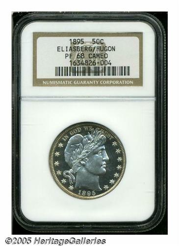 <B>1895<50C> PR68 Cameo NGC.</B></I> Ex: Eliasberg/Hugon. This is a magnificent proof striking, and it is a coin that has been preserved in essentially "as struck" condition since the year John Clapp purchased it from the Mint. There are no hairlines on either side. The fields are deeply and unfathomably mirrored with pleasing mint frost over the devices, which yields a noticeable cameo contrast. The obverse is mostly brilliant with a slight accent of golden color around the margin, while the reverse is several shades deeper in color and there is also a significant presence of red intermixed with the golden patina. According to the May <I>Census Report,</B></I> five other 1895 halves have also been accorded the PR68 grade with one coin even certified as PR69! However, none can claim the pedigree of this important and visually stunning coin.<BR><I>Purchased by J.M. Clapp directly from the Philadelphia Mint; John H. Clapp; Clapp estate, 1942, to Louis E. Eliasberg, Sr.; Eliasberg Sale (Bowers and Merena, 4/97), lot 2073; John C. Hugon Collection (Heritage, 1/05), lot 4275.</B></I>
